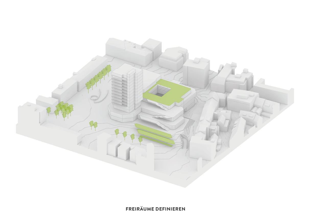 Die Definition der Räume durch die Straßenräume wird durch die Anpassung der Verkehrsführung korrigiert. Die Anbindung für Fußgänger wird gestärkt und auf den frei gewordenen Flächen Freiräume geschaffen. Durch die Abkehr vom alleinigen Fokus auf den Individualverkehr können auch die angrenzenden Lagen und die Anbindung für alle Verkehrsteilnehmer verbessert werden.